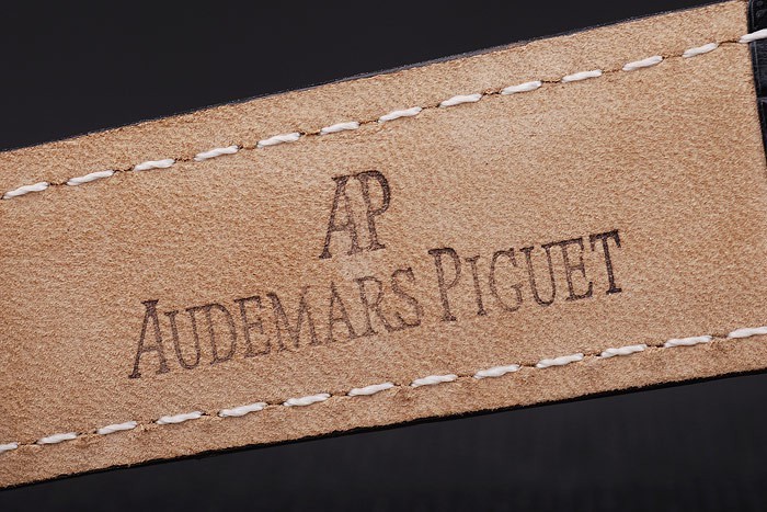 Rannekoru: Musta krokotiili nahkahihna valkoiset tikkaukset & lämmön kohokuvioitu Audemars Piguet nimi & logo sekä Audemars Piguet kaiverrettu ruostumatonta terästä flip-over koukku Lukko