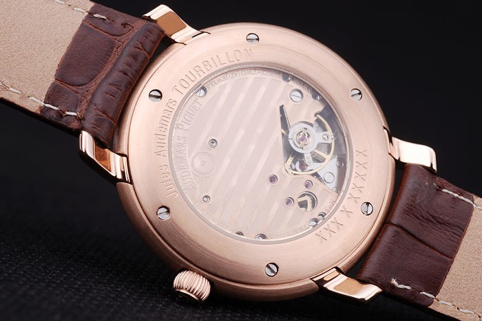 Takaisin: 18k Ruusu-kullattu ruuvattu alas palannut mekaniikka paljastava avointa keskus & Jules Audemars Tourbillon engravings