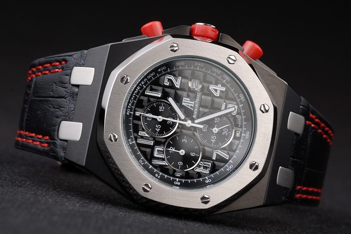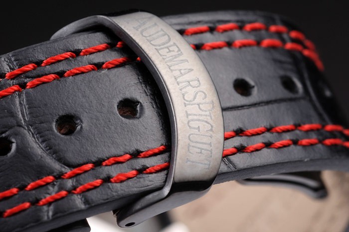 Rannekoru: Lämpö kohokuvioitu Audemars Piguet musta krokotiili nahkahihna kaksinkertaisella punaiset tikkaukset & Audemars Piguet kaiverrettu ioni päällystetty taitettavan Lukko