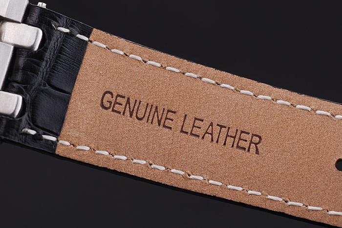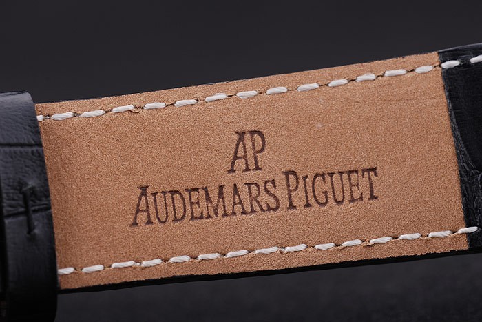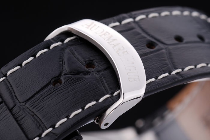 Rannekoru: Musta krokotiili nahkaranneke valkoinen juova tikkaukset & lämmön kohokuvioitu Audemars Piguet nimi & logo sekä Audemars Piguet kaiverrettu ruostumatonta terästä flip-over koukku Lukko