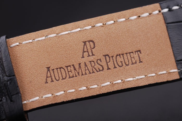 Rannekoru: Musta krokotiili nahkaranneke valkoinen juova tikkaukset & lämmön kohokuvioitu Audemars Piguet nimi & logo sekä Audemars Piguet kaiverrettu ruusu-kullattu flip-over koukku Lukko