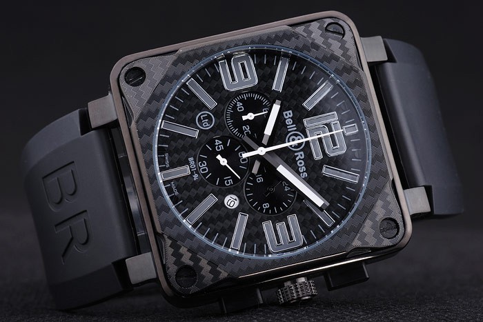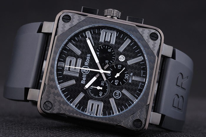 Rannekoru: Heat kohokuvioitu Bell & Ross logo & tuotekoodi musta kumisilmukka ionin -plated hook-solki Lukko