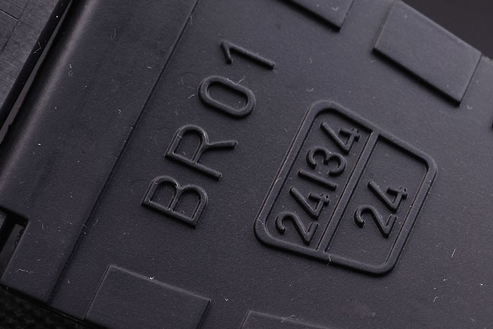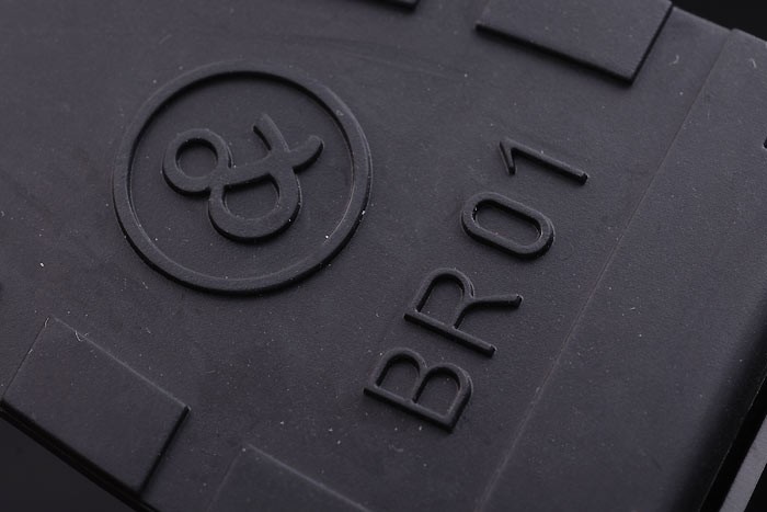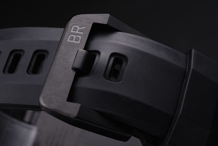 Rannekoru: Musta kumisilmukka lämpöä kohokuvioitu logo, malli- & tuotekoodi & BR kaiverrettu ioni päällystetty hook-solki lukko