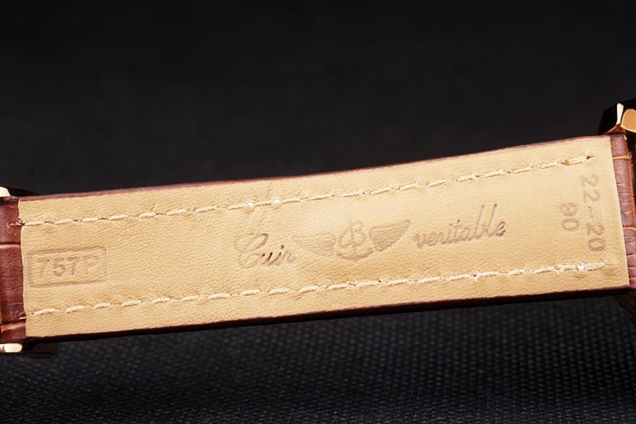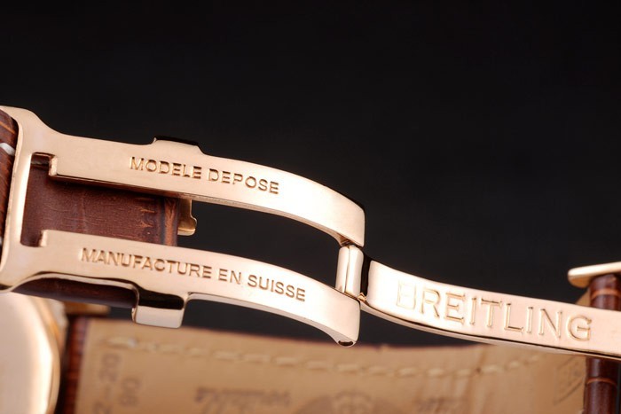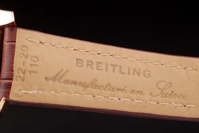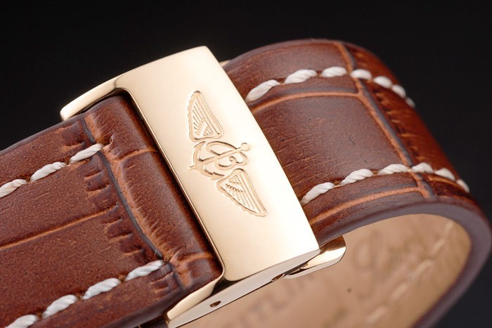 Rannekoru: Brown krokotiili nahkaranneke patentti valkoiset tikkaukset & lämmön kohokuvioitu Breitling kaiverruksia & kaiverrettu 18k keltainen kullattu kertaiseksi lukko Breitling logo top