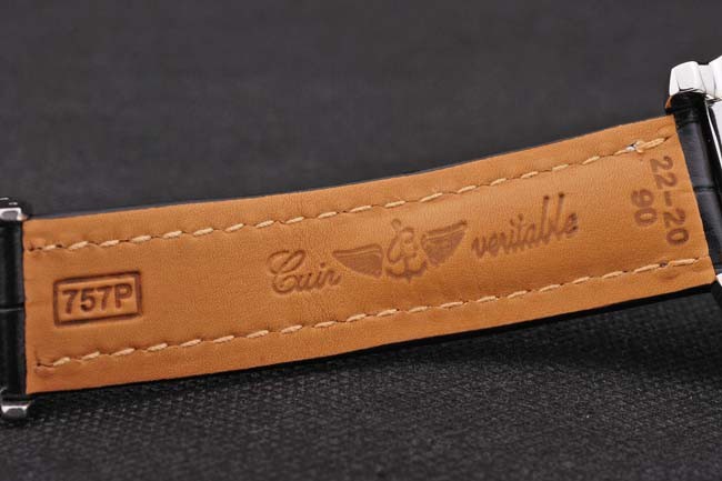 Rannekoru: Musta laadukkaasta nahasta on krokotiili kuvio , raskas valkoinen puuvilla ompelemalla. Tan sisempi kaista on stanssattu Breitling nimi & logo, & on teräs soljen closure.