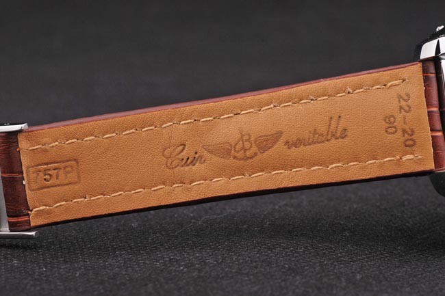 Rannekoru: Lämmin tummuvat korkea-asteen nahka on krokotiili kuvio, jossa raskas valkoinen puuvilla ompelemalla. Tan sisempi kaista on stanssattu Breitling nimi & logo, & on teräs soljen sulkeminen.
