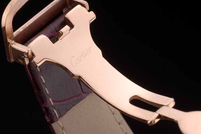 Rannekoru: Cartier lämpö kohokuvioitu violetti krokotiili nahkaranneke 18k Ruusu-kullattu fold-in lukko solki