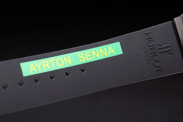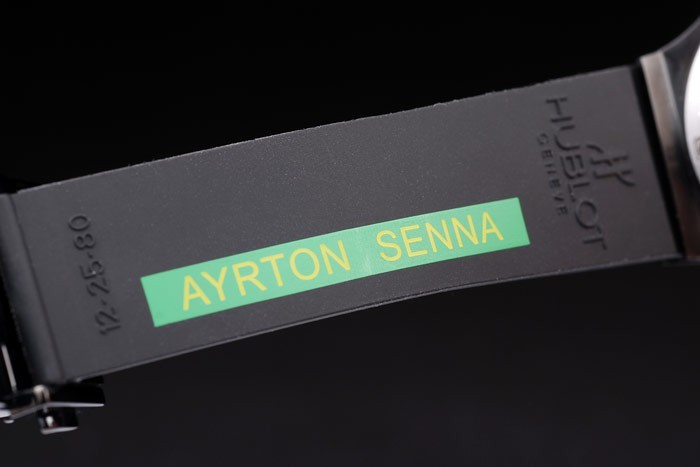 Rannekoru: uurrettu musta kumisilmukka Hublot Geneve kohokuvioitu sisäpuolella yhdessä vihreä Ayrton Senna leima & taita-koukulle-solki lukko kanssa Hublot Geneve engraving