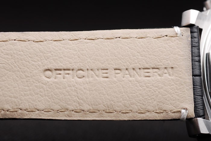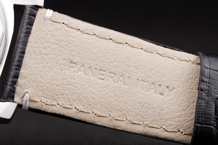 Rannekoru: Musta krokotiili nahkahihna valkoiset tikkaukset & lämmön kohokuvioitu Officine Panerai Italian leima & harjattua ruostumatonta terästä taitettava in koukkuun lukko kanssa Panerai engraving