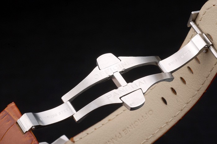 Rannekoru: Ruskea nahkahihna lämpöä kohokuvioitu Officine Panerai Italian leima & harjattua ruostumatonta terästä taitettava in hook lukko kanssa Panerai engraving