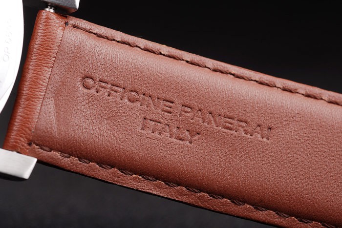 Rannekoru: Ruskea nahkahihna valkoiset tikkaukset & lämmön kohokuvioitu Officine Panerai Italian leima & harjattua ruostumatonta terästä koukku-solki lukko kanssa Panerai engraving