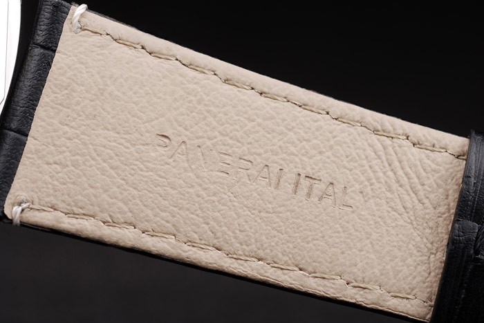 Rannekoru: Musta krokotiili nahkahihna valkoiset tikkaukset & lämmön kohokuvioitu Officine Panerai Italian leima & harjattua ruostumatonta terästä koukku-solki lukko kanssa Panerai engraving