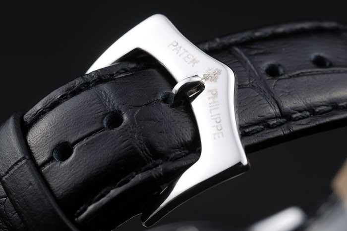 Rannekoru: Musta nahkaranneke Patek Philippe leimalla tai ruostumattomasta teräksestä kertaiseksi Lukko