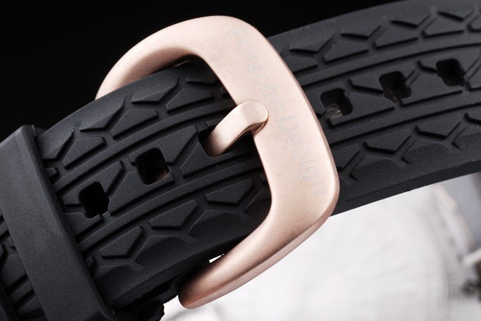 Rannekoru: Rengas-ura mustaa kumia hihna lämpöä kohokuvioitu Porsche leima & Ruusu-kulta koukku-solki lukko Porsche inscription