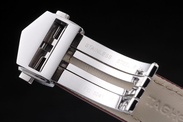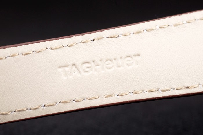 Rannekoru: Tag Heuer lämpö kohokuvioitu tummanruskea krokotiili nahkahihna valkoiset tikkaukset & harjattu teräs painike release kertaiseksi lukko Tag Heuer engraving