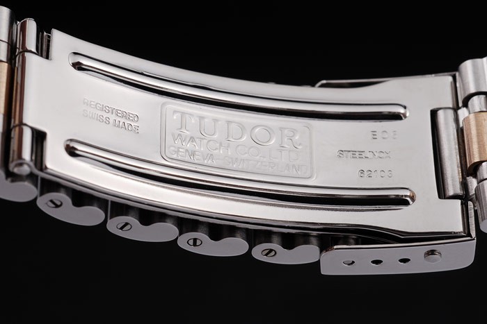 Rannekoru: Kaksi äänisen harjattua ruostumatonta terästä & keltainen kullattu yhteys rannekoru Tudor kaiverrukset & push release fold-over lukko Tudor logo top